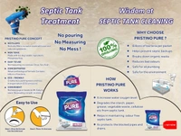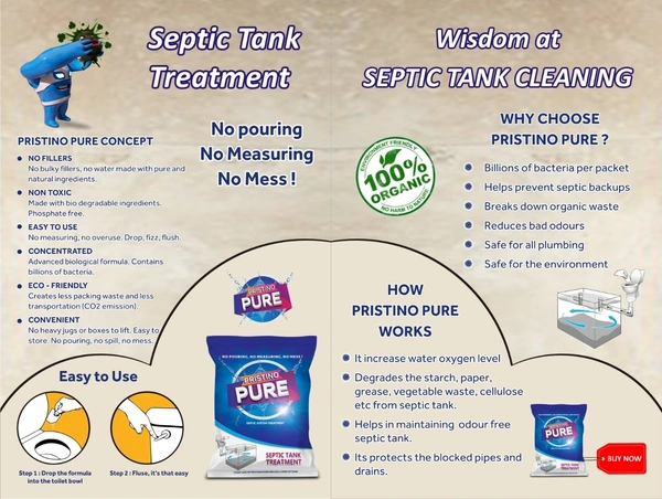 PRISTINO PURE is a Septic tank formula which is easy to use. This septic tank formula releases many environmental friendly microbes (AEROBIC AND FACULTATIVE bacteria) which keeps your drainage waste water system clean up to 20 years.
